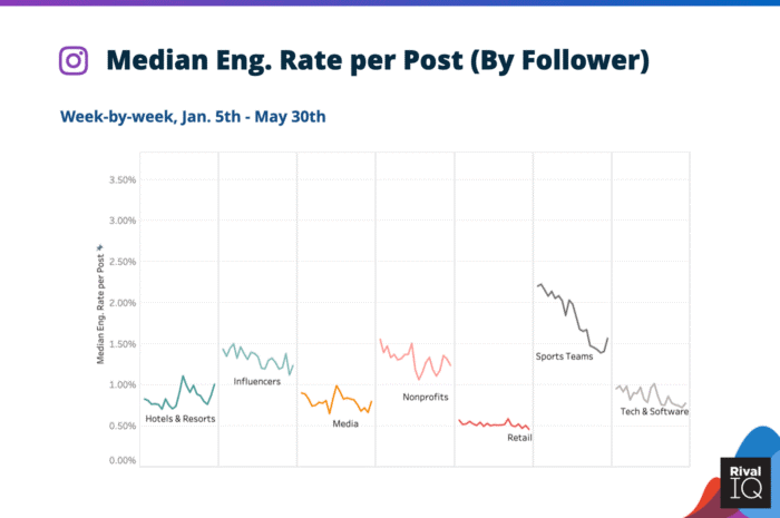 As you can see in the chart above, industries such as fashion, health & beauty and financial services have taken a hit with a certain amount of fluctuation, but the trend is that there is lower engagement. The financial services statistics seem to be the most erratic and fluctuation of the group, but all of them have been affected in one way or another.